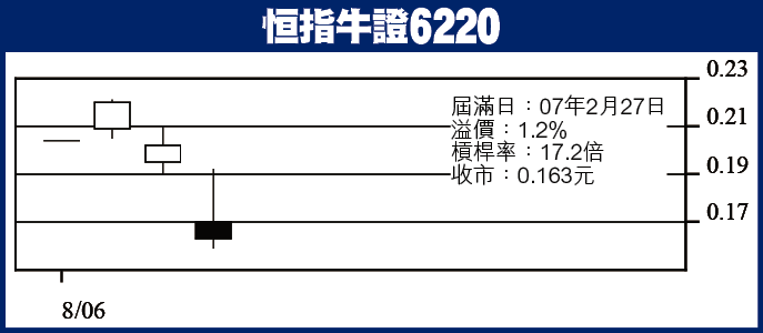 恒指牛證6220:恒指牛證共有8隻,6220同6218買賣比較易,向呢兩隻埋手。喺乜嘢位入市,臨場執生,最理想係恒指能夠再跌100點買入。