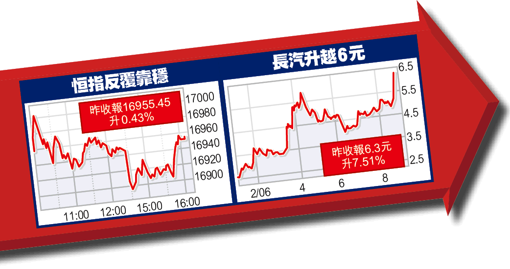 【本報訊】恒指昨日反彈,早段曾隨日股抽升122點,重返萬七關,但數隻藍籌因業績只達市場預期下限令股價跌幅持續擴大,加上日股尾市掉頭回落,幸得中移動(941)、滙控(005)及中海油(883)力撐,恒指才不致倒跌,但全日升幅收窄至72.41,收報16955.45。H股指數表現遜恒指,最多跌62.52,收6868.53,跌29.33。大市總成交241.36億元。