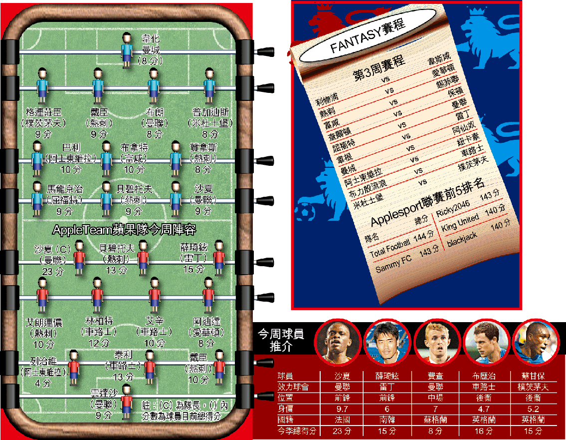 英超FantasyLeague專版又再同各位讀者、玩家見面,Applesport自開咧以來獲得不少玩家加入,現時已有近1,900隊參加,而且在全球最佳成績的私人聯賽中位列第3,平均分達142分,真係多謝各玩家鼎力支持。