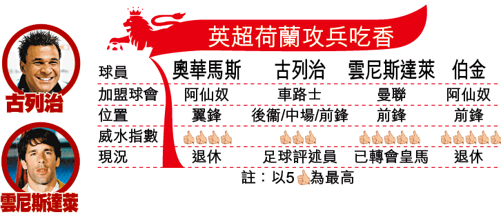 其後,阿仙奴引入了法國籍教頭雲格,後者靠荷援伯金及奧華馬斯之助,為球隊在98年奪得足總盃及聯賽雙料冠軍,證明了荷蘭球員可以在英超找到落腳點。近年,大家固然不會忘記前曼聯射手、現已轉投西甲皇家馬德里的雲尼斯達萊。