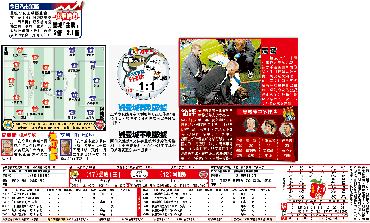 唯一對阿仙奴有利的是,他們近年作客曼城都能夠取得勝利,對賽往績方面佔到優勢。足智彩今仗開出「讓球主客和」,阿仙奴一方讓球,但「主勝」是3項中賠率最熱一瓣,為2.1倍。此外,1.7倍的入球「細」亦可捧。
