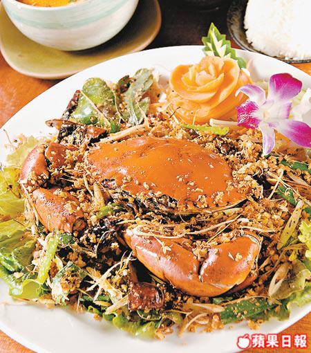 1斤重新鮮肉蟹,加入南薑、香茅、辣椒、蒜、香草等炒香,啖啖蟹肉非常入味,不過辣到噴火,小心。