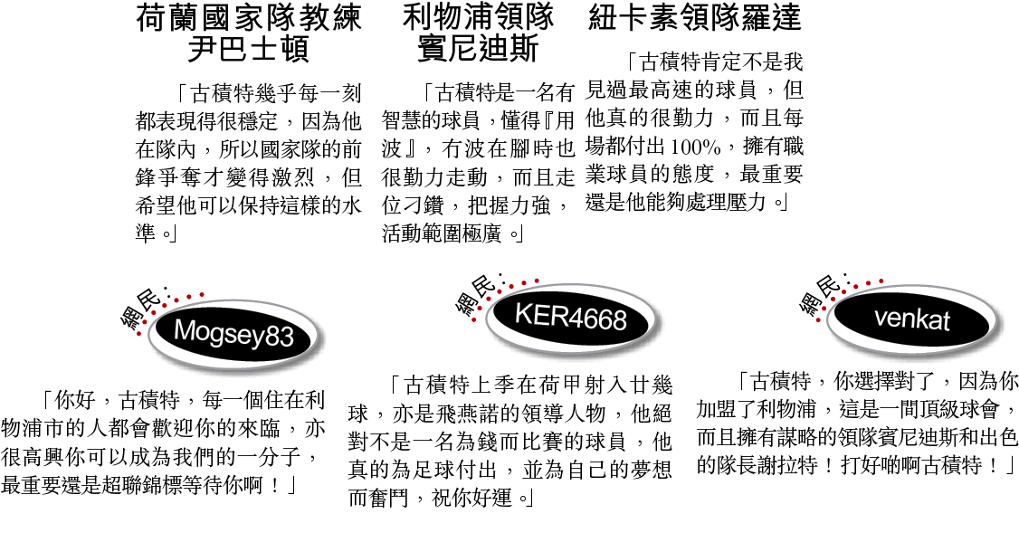 古積特不諱言今次轉會有「媒人」從中作梗:「洛賓告訴我,英格蘭球迷簡直一流,熱情而不狂亂,而且忠心,他坦白跟我說利物浦是今屆有力挑戰車路士的球隊。」儘管紅軍目前兩名荷蘭援將還未對球隊有重大貢獻,但賓帥就指古積特為「像一名英格蘭球員多過荷蘭球員。」暗示了對「蜑家仔」將很快適應到英超節奏,安定下來。