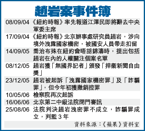 《紐約時報》昨在頭版報道趙岩被判監三年的消息,形容法院的裁定大出外界預期。該報執行總編輯凱勒(BillKeller)在聲明中指出,裁決是對趙岩的平反:「我們向來表示,就我們所知,趙岩從事的只是新聞工作。」