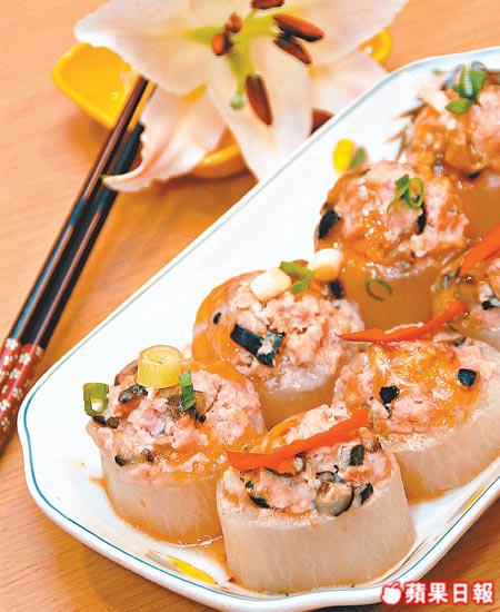 做法:免治豬肉調味醃好,加入冬菇粒攪至起膠;釀入1吋厚件及挖空中心的白蘿蔔中。熱油鑊煎釀蘿蔔,灒水焗至八成熟。加鮑魚汁及冬菇水,燜煮片刻撈起蘿蔔,剩汁埋芡淋上蘿蔔面。