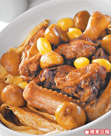 做法:米鴨斬件,加醃料醃20分鐘。燒熱油鑊炒鴨件至半熟,加入栗子炒勻,然後加入汁料燜煮45分鐘。枝竹浸軟切段,瀝亁水後與白果一起放入鑊中燜煮15-20分鐘,炒勻即成。