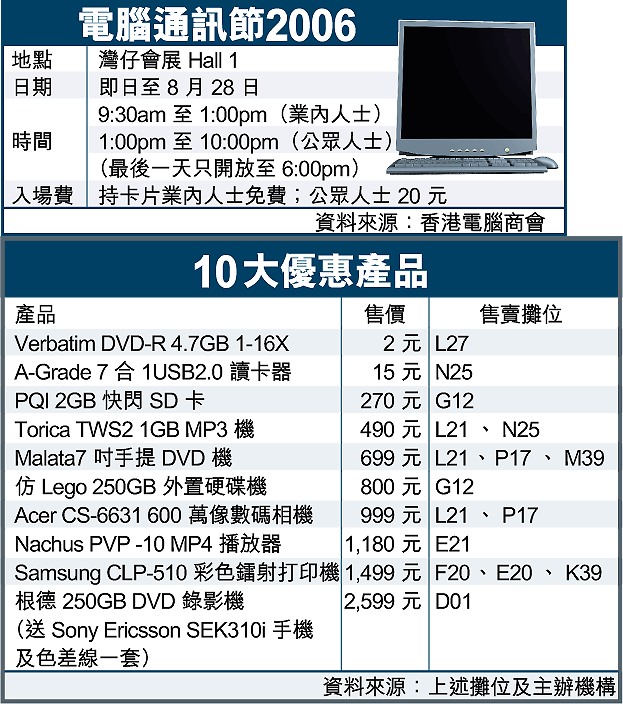 【本報訊】展商相爭,消費者得利。香港電腦通訊節昨日甫開幕,300參展商已紛紛劈價搶客,有低至88元一部的MP3機,也有僅售百多元1GB記憶卡,有展商更以買手提電腦送10多樣贈品作招徠。主辦機構香港電腦商會會長張耀成表示,今年展商數目多,競爭激烈,預料今、明兩日會「再減多啲、再送多啲嘢」! 記者:黃可欣
