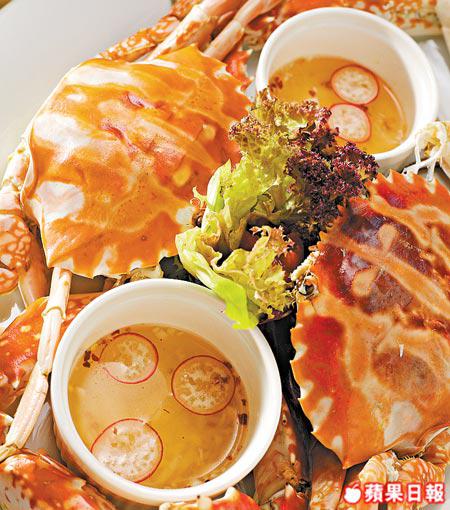 Ken:「餐牌入面無呢道菜,客人想食就要預訂,我會揀選當日新鮮靚蟹入饌。今日就揀咗呢隻紅蟹,蟹肉好鮮甜㗎!個汁係我自己調配嘅,用咗醋、蒜茸、胡椒同埋紅番椒,點呢個汁可突顯蟹肉鮮味。」
