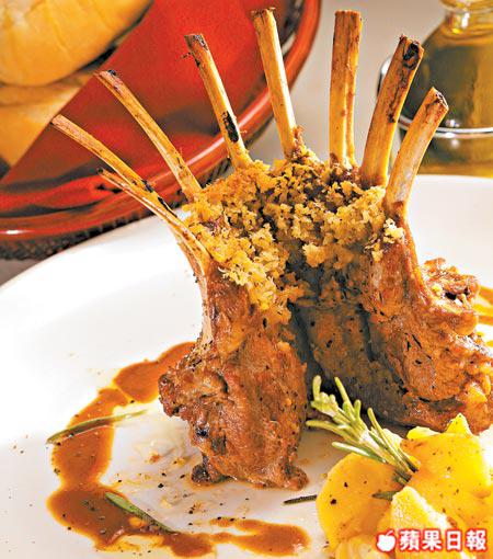 用芥末、香草、欖油醃新西蘭羊仔,撒麵包糠焗至半熟。半生熟羊肉鮮嫩多汁,跟麵包糠一齊咬,多層脆口感覺好惹味。