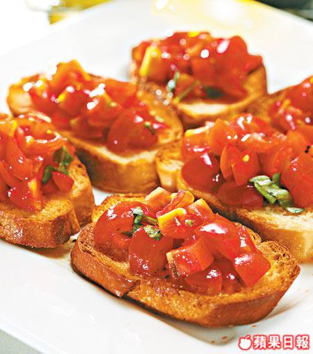 一般做法係切粒蒜茸撒上番茄,但Ken將蒜茸搽喺剛焗完嘅麵包上,除蒜茸香味之餘,咬落茄味勁出。
