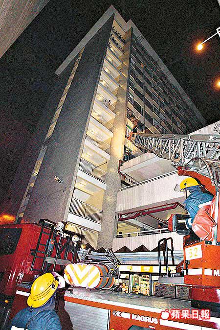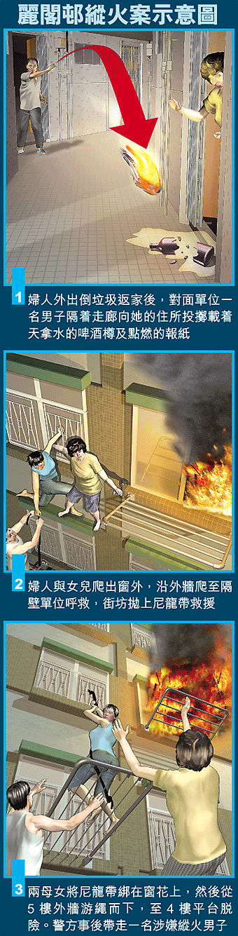 【本報訊】深水埗麗閣邨昨晚發生投擲「燃燒彈」事件,一名精神失常男子將滿載天拿水的啤酒樽及一團點燃的報紙擲入鄰居家中,導致單位起火,一對母女身陷火海攀窗逃生,街坊見狀拋繩索救援,母親從大廈五樓游繩而下,至四樓對開平台脫險後嚇得抱頭痛哭,事後獲送院治療。警方案發後根據母女提供的資料,帶走一名被指縱火男子。深水埗警區重案組接辦。