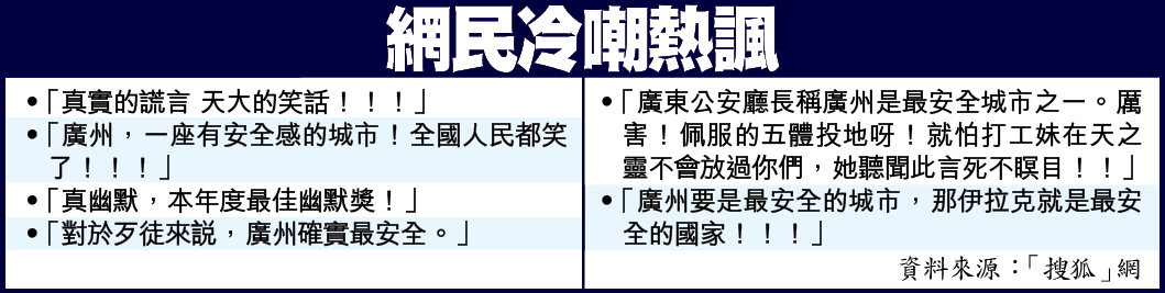 「廣州最安全,全國人民都要笑了!」「真實的謊言天大的笑話!!!」廣東省公安廳長梁國聚在巡視廣州市時聲稱,廣州是全國最安全城市之一,隨即引起內地網民嘩然,紛紛嘲諷他說了一個大笑話。與此同時,廣州公安近日展開反罪惡行動,破獲至少30宗嚴重罪案,包括搗破一個專劫外國人的「色誘黨」,以及用迷信之說進行詐騙的「祈福黨」。