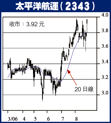 受航運業今年上半年營運狀況欠佳所影響,太平洋航運(2343)中期盈利只有3640萬美元,較05年同期倒退57.43%。然而,反映航運費用走勢波羅的海指數自今年6月中開始大幅回升,相信下半年盈利將較上半年大幅改善,前景可看高一線。現價相當於約8倍06年度及6.5倍07年度預期PE,估值合理。筆者相信集團會維持較高的派息比率,06年度及07年度預計息率近10厘及11.5厘,具有一定的吸引力,投資者不妨待股價回落至3.75元附近吸納,中線目標4.40元,止蝕3.55元。