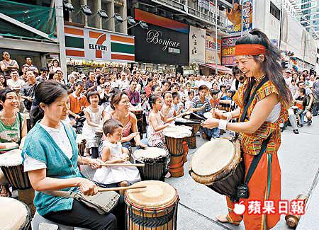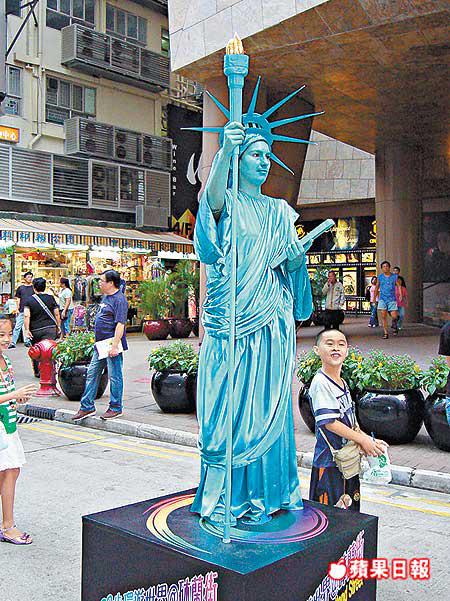 【本報訊】由市區重建局、朗豪坊與香港遊樂場協會舉辦的「八十步環遊世界人員穿着特製服飾,打扮成世界各地的名勝,如法國的巴黎鐵塔及美國的自由神像;還有作英國士兵及非洲土人裝扮的表演人員,不斷扮鬼臉吸引遊人,令砵蘭街頓時變身成世界嘉年華。 主辦單位更邀請了美國粉筆畫大師TracyLeeStum到砵蘭街,畫了一幅以鯉魚塘為概念的立體街頭畫,一批年輕人更即席用塗鴉方式繪出長城及龍,把中國題材融入西方藝術。