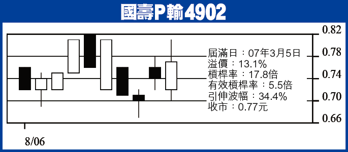國壽P輪4902:國壽(2628)今日派半年成績表,上周五跌0.16元。P輪4567由6.3仙飛上9.1仙,飛升44%,有278球易手,金額24球。唔使眼紅炒家1日之間賺到笑,睇番轉頭,6月中最高價1.47元,到𠵱家同totalloss冇乜分別。隻輪11月尾夠鐘,行使價10.88元,正股要喺3個月內散2.82元以上,隻輪先至唔使用嚟墊煲底。就算炒國壽業績見光死,都無謂搞4567。