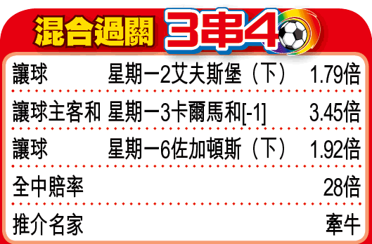 同日推介另一支客軍艾夫斯堡,艾夫斯堡由國腳安達斯史雲遜率領,近期大勇,已累積7仗不敗,亦升上榜首位置;今仗作客近兩仗失分的哥登堡,受讓平/半可再追。另外,卡爾馬因為參戰圖圖盃,令球隊陷於低潮,可幸卡爾馬上仗已擊敗佐加頓斯,喜見反底,今仗有力主場擊敗加費萊。考慮卡爾馬今季6場勝仗,有3次為僅勝對手1球,可博卡爾馬讓球主客和「和局」。