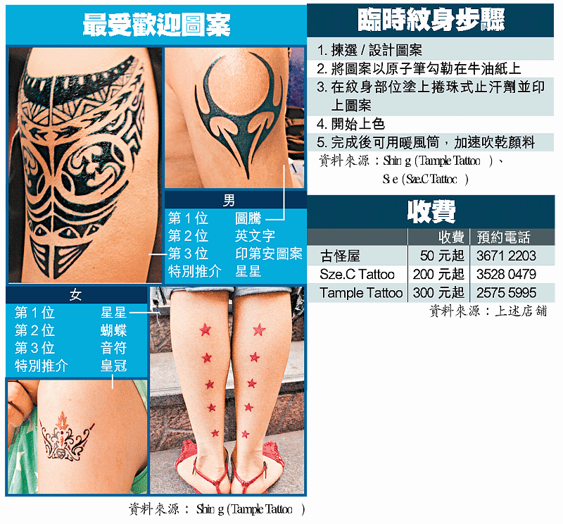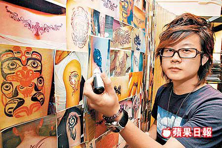 提供黑、紅、黃、藍四色臨時紋身的穿環紋身店「古怪屋」紋身師Ray稱,今季臨時紋身生意勁升逾一倍,「有個客仲要求畫晒成個背脊,用咗九百幾蚊!」