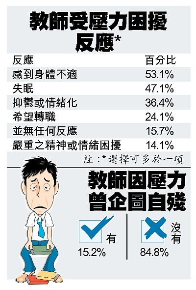 逾五成教師表示曾因工作壓力感到身體不適,也有近五成人有失眠情況,四成人更感到抑鬱或情緒化。令人憂慮的是,15%受訪教師承認曾因工作壓力企圖傷害自己。教育評議會副主席、風采中學校副校長何漢權指出,教師壓力與教改有關,並建議教師面對工作時也要懂得量力而為,不要給自己太大包袱。