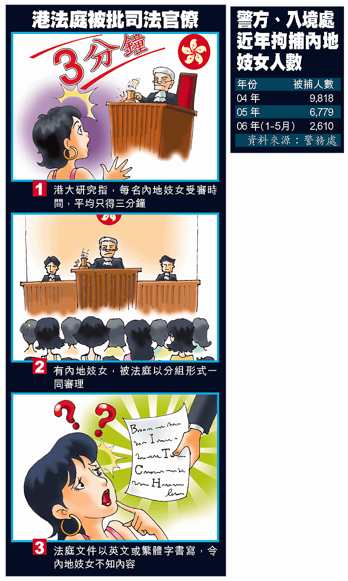 【本報訊】本港今年頭五月每天平均有17名內地妓女被捕,香港大學的研究發現,她們被捕後隨即墮進「官僚式」司法程序,往往要與其他被告「合併聆訊」;每名被告審訊時間平均只得3分鐘。流水作業的審訊過程,令部份被告難以在法庭上反映其個別情況,有被告認為自己無辜,但最後惟有認罪。 記者:雷子樂