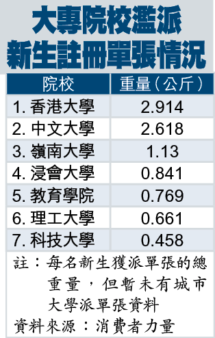 消費者力量於上月至本月底,到訪七間大專院校為新生拿到的「註冊包」磅重,結果發現香港大學派發單張及小冊子最多,每名新生平均會取2.914公斤紙張;其次是中文大學及嶺南大學,新生分別要拿約2.6及1.1公斤紙張。