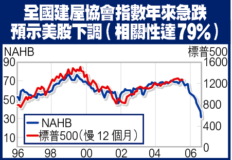 最後,我哋對家「美林證券」嘅分析員做過一個統計,就係美國樓市指數走勢對12個月之後嘅股市走勢,有高達八成嘅預測能力(見圖)。而呢個樓市指數好多個月之前已經開始大幅下跌。我用email寄個圖你睇。