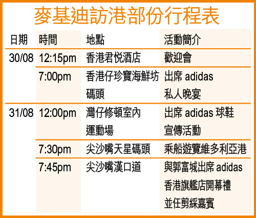 T-Mac此行主要是參加商業活動,除出席周三黃昏舉行的adidas香港旗艦店開幕禮(見附表)、推廣RetroT-Mac1籃球鞋及亞洲限量版T-shirt外;亦會出席明日中午,在灣仔修頓室內運動場舉行的青少年交流活動,與球迷近距離接觸,屆時T-Mac將與本港籃球發燒友及精英分享球技及心得,亦會「露兩手」施展其超卓球技。