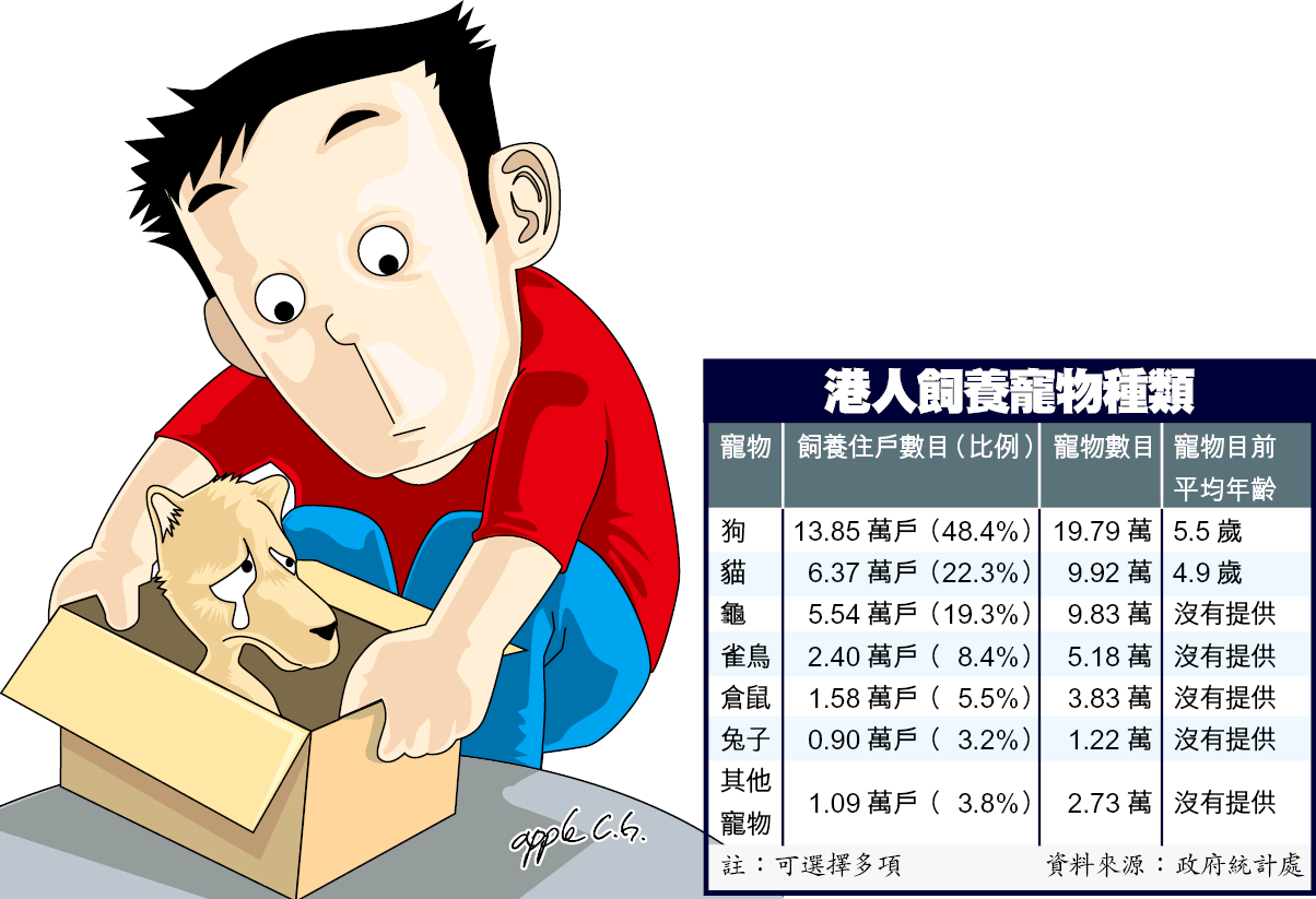 統計處昨日公布港人飼養寵物統計數字,在受訪的227萬戶港人中,有28.6萬戶有飼養寵物,即約平均10戶即有1戶飼養寵物,以狗隻最受歡迎,有近半數人飼養狗隻;另兩成人養貓;近九成人更飼養一隻或以上的寵物。