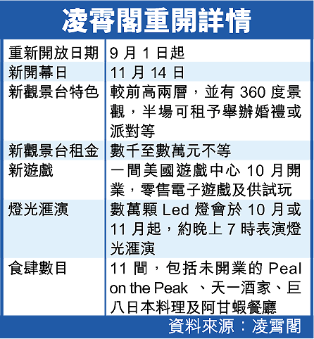 【本報訊】欲窮千里目,更上一層樓;經翻新後於本周五再開放的山頂凌霄閣,會將觀景台搬高兩層,讓遊人可遠眺360度的維港美景,更會租予賓客開派對,或讓新人舉行天幕下的婚禮。場內也增加特色食肆及商舖,務求打破每年700萬名遊人的紀錄。 記者:黃可欣