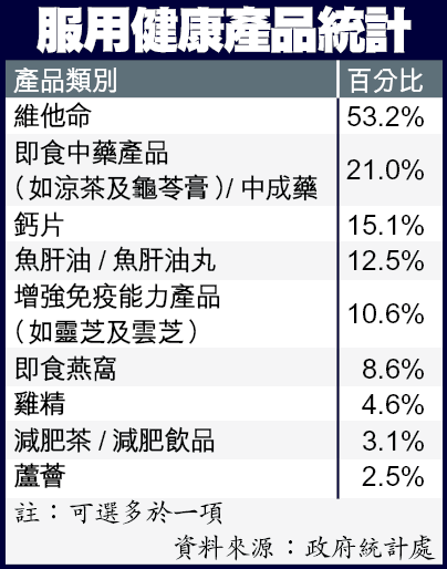 政府統計處昨日發表《服用健康產品的情況》調查報告,顯示在接近130萬年齡15歲及以上的香港人中,有22.8%曾於受訪前12個月內服用健康產品,當中以35至44歲最多,佔29.3%;65歲及以上最少,佔16.5%。