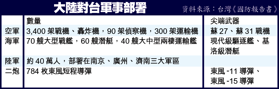 近年台灣《國防報告書》與美國國防部的中國軍力報告一樣,都會特別提到大陸瞄準台灣的導彈部署。美國國防部今年5月的報告指,中國對台部署了710至790枚短程導彈,而今次台灣《國防報告書》的數字更為詳細,並指瞄準台灣的導彈正以每年75至100枚的速度增加,同時重點提升彈道導彈與巡航導彈的打擊精準度,以求達成對特定政治、軍事目標、重要節點精確攻擊,達到斬首或令台灣指揮中心失能。