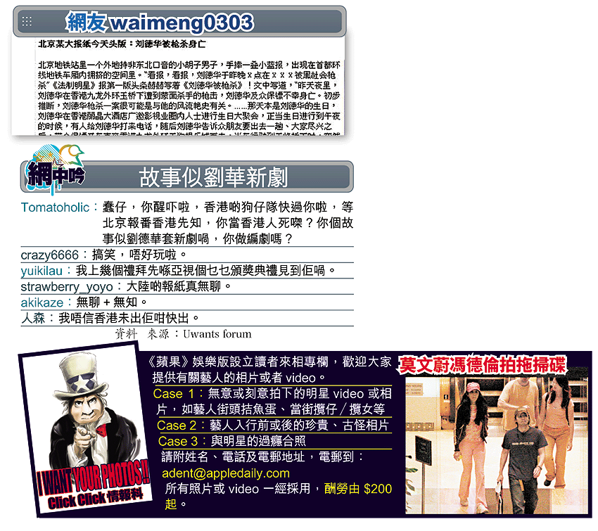 日前在Uwants討論區中,網友waimeng0303轉貼了一份名為《法制明星》北京報章的報道和照片,指近日北京地鐵站外有人售賣一份名為《法制明星》的報紙,版頭寫着「劉德華被槍殺」,內文指華仔生日當天在香港麗晶大酒店開生日會,然後帶同保鑣到根本不存在的九龍外環天狗娛樂城,還說華仔駛至玉峰橋時突遭蒙面殺手開槍伏擊,中槍身亡。