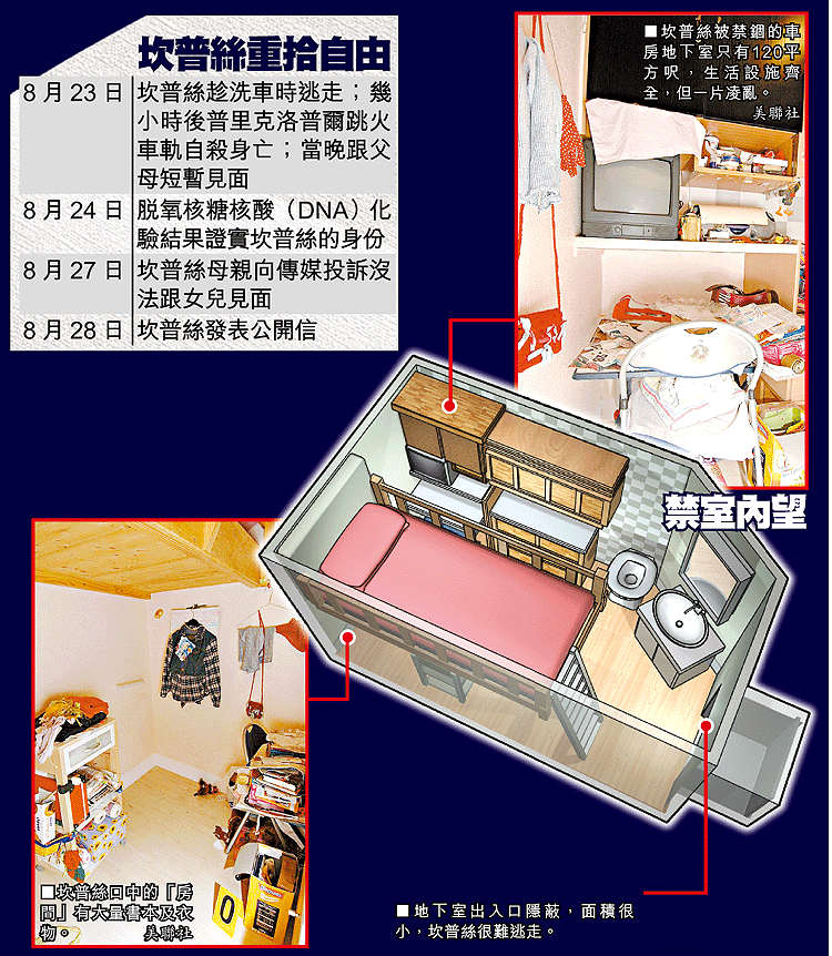 坎普絲現年18歲。她10歲時在維也納上學途中被擄走,警方搜遍全國,都找不到她,她八年來恍似人間蒸發。直至上周三,她在花園抹車,吸塵時他走遠一點,她抓住機會,丟下仍開動的吸塵機逃跑。她逃走後,44歲的普里克洛普爾即日跳火車軌自殺,遭高速駛來的火車輾成肉醬。