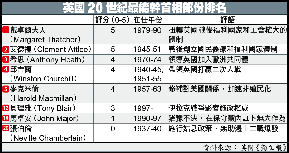 除了排名,貝克特還給每位首相0-5分評分。與戴卓爾夫人同得5分的艾德禮,是福利國家體制的創建人;邱吉爾帶領英國打贏二次大戰雖功高,但輸了大選,內政建樹不多,只得4分,排第4。
