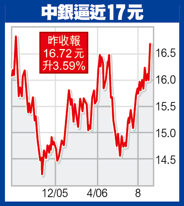 由於中期業績理想,中銀香港(2388)及母公司中國銀行(3988)股價昨雙雙造好,前者更創逾一年新高,收市報16.72元,升幅3.59%。高盛、瑞銀、美林及大摩齊調高中銀香港目標價,介乎17.75至20.3元,升幅9至13%。證券行也普遍調高今年度中銀孖寶的盈利預測,其中高盛將中行06年盈利預測,上調3%至374億元,跑贏中行在招股書內的今年盈利預測。