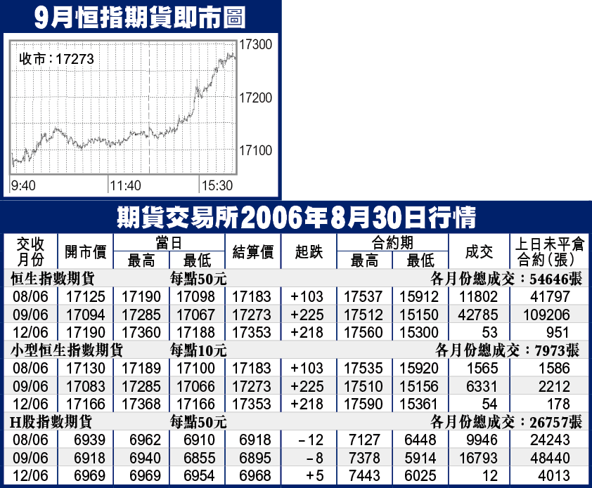 即月期指以17143結算,9月期指以17094高開後,隨即突破17220阻力,尾段持續加速,確認短期見底,以17273高收,升225點,低水11點。