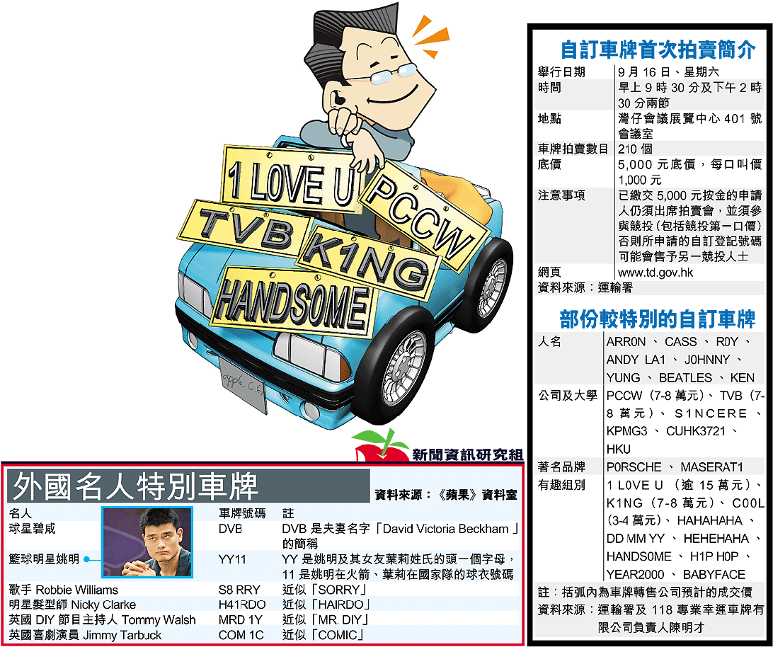 【本報訊】運輸署下月16日舉行首次自訂車牌拍賣,首批210個公眾可參與競投的車牌號碼昨日曝光。除了與人名或特別日子有關的車牌外,有市民發揮創意,利用自訂車牌「1L0VEU」(我愛你)示愛;又有不少令人會心微笑的車牌,如「HEHEHAHA」(嘻嘻哈哈)及「HANDS0ME」(英俊)等。經營車牌轉售的公司預計,部份自訂車牌具炒賣價值,其中「1L0VEU」車牌可望以高出底價近30倍、即逾15萬元成交。 記者:盧文烈 陸羽平
