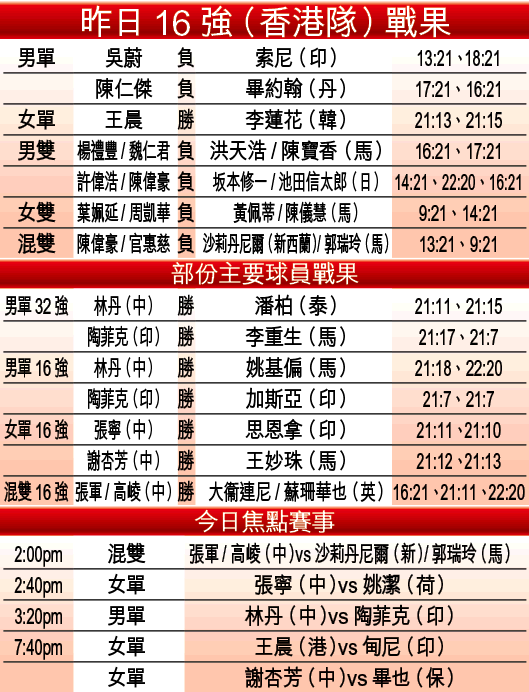 昨日第3日的「香港公開羽毛球錦標賽」成為港隊大部份成員的墳墓,除了世界排第3的王晨順利過關外,其餘皆於16強止步;今日焦點賽,首推下午3時20分中國林丹對印尼陶菲克一仗,是去年世界賽決賽翻版。
