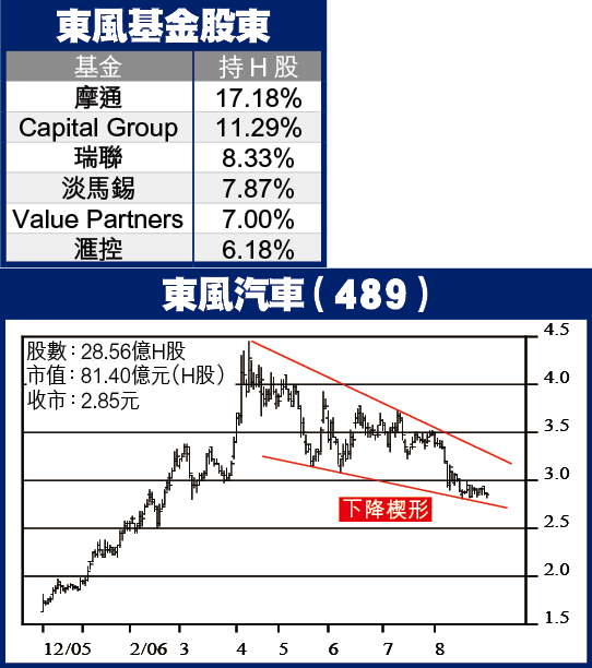 ■東風是國內第3大汽車集團,H股28.56億股,連同無上市的內資股57.60億股,總股數86.16億股,總市值246億元,較駿威汽車(203)更大。H股市值81.40億元,減去持股量須披露的基金持股量,其餘街貨約42%值34億元。
