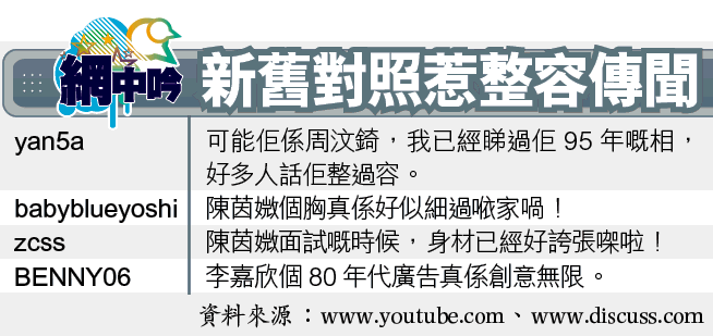 科技發達,一眾女星可以愈變愈靚,不過也因為科技發達,她們未紅時的演出都可以輕易重溫,盛傳隆胸的港姐冠軍陳茵媺,以及屢次被傳整容的周汶錡早年拍攝的廣告,近日不約而同被網友放上網,就連李嘉欣未當選港姐前的陳年香口膠廣告,也可以隨便睇,變靚法術即時無所遁形。 撰文:凌零發