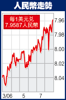 【本報訊】內地官方傳媒報道,人行繼加息來調控宏觀經濟後,可能會透過放寬人民幣滙率波幅來增加炒升值的資金成本。不過,市場對此解讀為容許人民幣升值加快,因此人民幣兌美元滙價昨日曾高見7.9565,收報7.9587,再創新高。