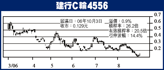 建行C輪4556:中資銀行股昨日最靚係中銀,彈升3.6%,估計其他中資銀行股亦會有少少運仔行,吼建行C輪。想出手快,收手亦快,諗4556。隻輪10月初夠鐘,輪價12.9仙,溢價0.9%,槓桿率26.2倍(有效20.5倍),引伸波幅14.4%。正股唔派息,唔使理除息因素。另1隻熱門C輪4578,輪價11.9仙,壽命比4556長1個月,但溢價則高2.9個百分點,咪搞呢隻。