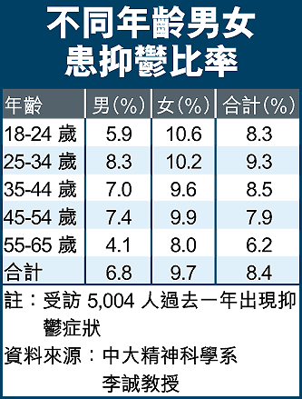 抑鬱人口中,女性較男性高1.4倍,比率以18至24歲及25至34歲女性最高,兩個組別女性分別有10.6%及10.2%出現抑鬱,比男性同齡組別只有5.9%及8.3%為高。