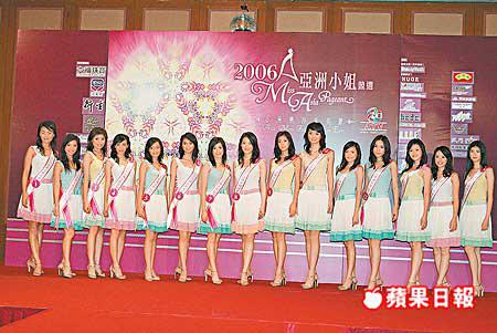 昨日15位入圍亞洲小姐競選「港澳特區賽區」的候選佳麗,在黃埔海逸酒店會見傳媒,她們穿上晚裝亮相,逐一自我介紹,參選佳麗年齡由17歲至24歲,當中除了港、澳代表外,還有來自美國、澳洲、日本、加拿大的參賽者。今屆候選佳麗質素普通,但卻出現了兩位「翻版」。