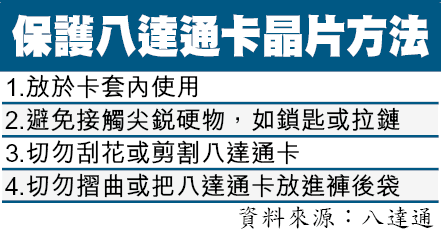 讀者陳先生不滿,現時的八達通卡質素,未如剛推出時耐用。他說:「我貪八達通夠方便,唔使帶定『散銀』搭車,所以五、六年前就開始買嚟用,出入靠佢外,後尾去便利店買嘢都用佢嚟畀錢。但因為用咗咁多年,大約兩個月前,張卡開始有少少爆開,於是換過佢!」