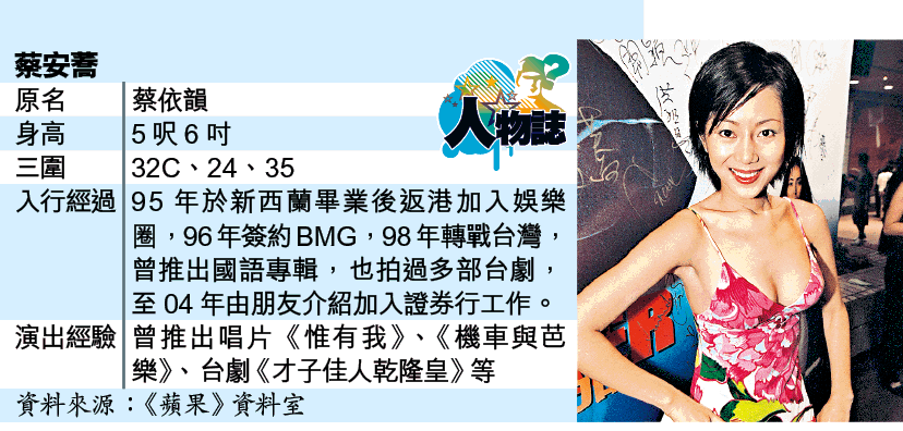 蔡安蕎早年加入樂壇後,一直發展平平,兩年前決定淡出幕前,遠赴澳洲留學,今日她已放下藝人身份,改投金融界,搖身一變成為金融之花。蔡安蕎表示假日最愛穿三點式與友人出海,不過就會刻意節食,避免露出小肚腩。