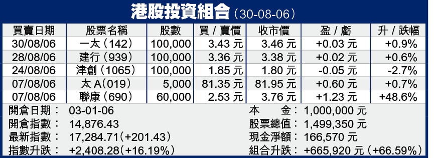 太A(019)終扭轉近期跌勢,升1.40元或1.7%。油價跌穿70美元,有利國泰(293),太A亦受惠。此外,如這一浪炒地產股,太A亦可重拾升軌,繼續作中線持有。