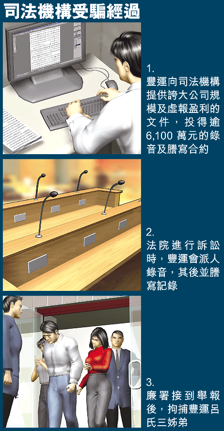 三名被告分別為身兼豐運的股東、董事、合約經理的呂美慈(41歲)、股東兼董事呂美莊(40歲)、助理合約經理呂遠暉(36歲),據悉他們為姊弟關係。司法機構04年6月為各級法院審訊提供的數碼式錄音及謄寫服務進行招標。三名被告涉於04年7月15日,串謀行騙司法機構。