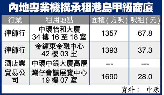 中原香港商業部營業經理梁嘉榮說,過去來港的內地公司,主要是省級機構,不乏租用全層;而今次來港的多為專業機構,承租一般少於2000方呎。