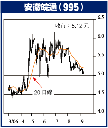 受惠於205國道天長段新線投入服務及其他路段交通流量增加所刺激,安徽皖通(995)中期純利較05年同期急增65.29%,達4.54億元人民幣,每股盈利0.274元人民幣。安徽省經濟正處於快速增長期,筆者相信省內未來仍需要大量興建公路網絡,集團將有機會參與這些建設。此外,集團已完成收購高界公司49%權益,及投資於馬壩至六合公路安徽段,為集團未來增長動力來源。現價相當於約10倍06年度預期PE,息率逾5厘,估值吸引。投資者不妨考慮在5.08元附近吸納,目標5.60元,止蝕4.80元。