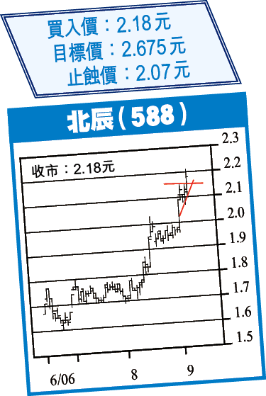 北京北辰(588)上日報收2.18元,升2.3%,股價自4月高位回落,跌至1.60元才反覆回升,8月重返250日線之後轉為在該長期線位橫行,上周突以大成交向上拋離250日線,發展旗形走勢後,上周五破旗而上,成交復增。技術上股價可望快速上試2.30元,破位向2.675元高位推進。若以4月至今的形態看來,股價最終有機會出現圓底走勢,目標亦是2.675元。現價買入,以2.07元作止蝕位,上破2.30元可加1注。
